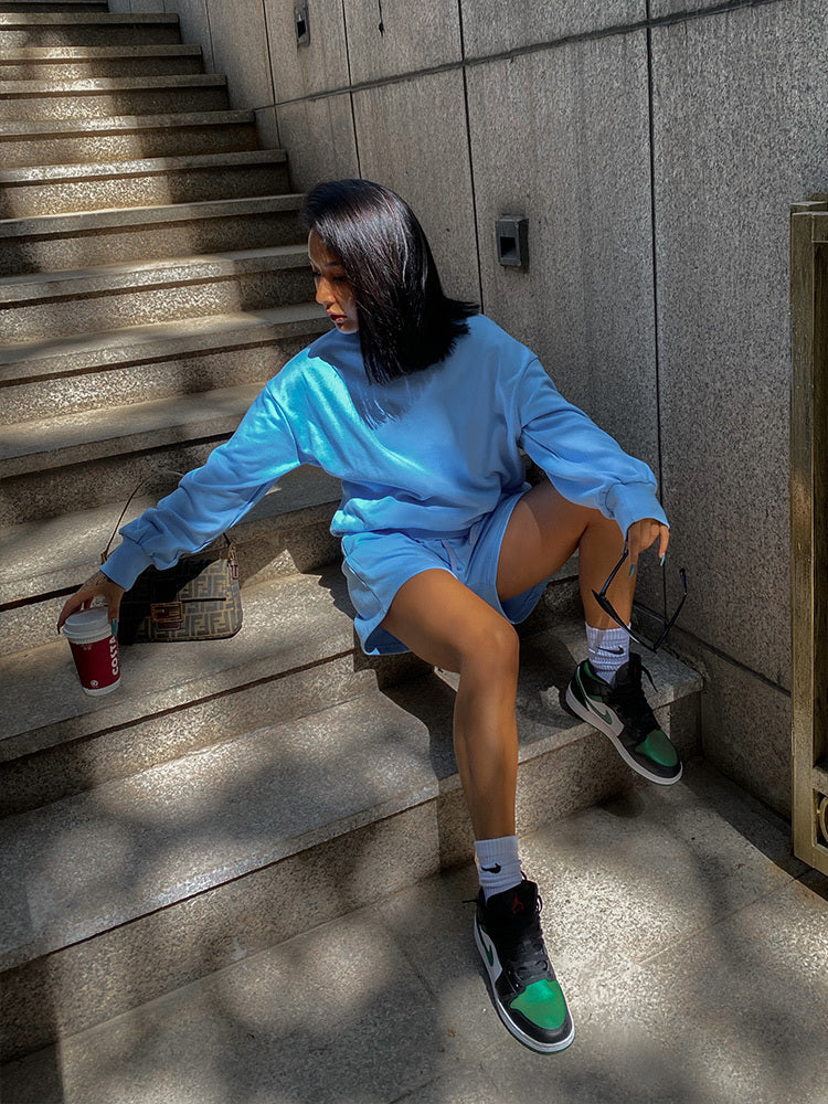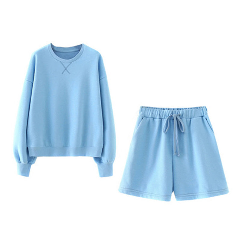Loose And Thin Solid Color Round Neck Long-sleeved Sweater With Shorts Two-piece Suit